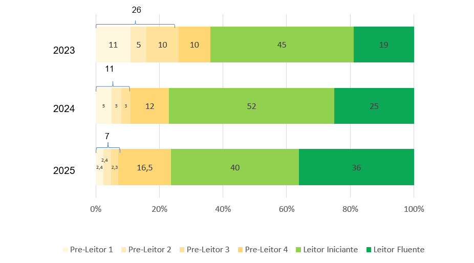 Desde 2023, este é o menor índice de alunos nos primeiros três níveis de pré-leitores: uma soma de 7% em 2025, 11% em 2024 e 26% em 2023. Isso significa que os alunos estão avançando, ao longo dos anos, rumo aos leitores iniciantes e fluentes.