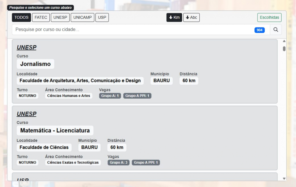 Na escolha dos cursos, cada aluno pode optar por um curso em cada universidade ou faculdade e ainda há o limite de dois cursos diferentes por universidade. Por exemplo, um aluno que escolher dois cursos na USP — economia e história, por exemplo — terá que registrar as terceira e quarta opções em outra universidade e faculdade, uma para a Unicamp e outra para a Fatec, por exemplo.
