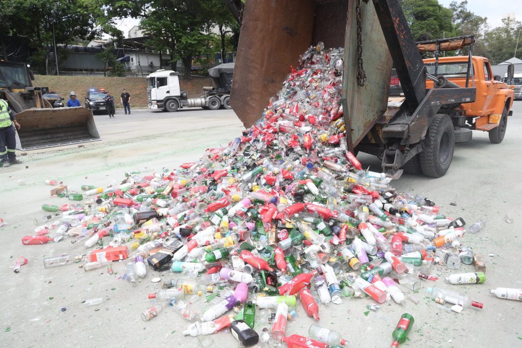 Mais de 100 mil garrafas vazias foram destruídas nesta quarta-feira (15). Foto: Alex Silva/Governo de SP
